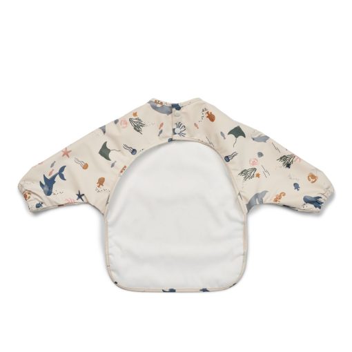 - Practical cape bib with long sleeves and playful print